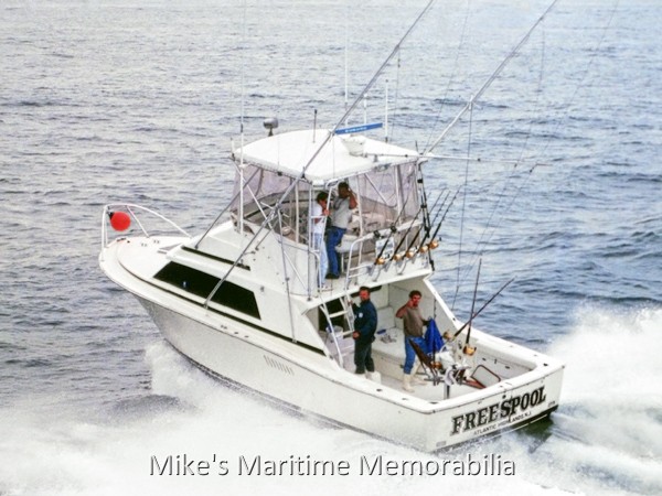 This wonderful aerial photograph taken from a helicopter during the 1997 Mako Mania Tournament shows the charter boat "FREESPOOL" underway. A 33-foot Bertram Yacht built in 1980 at Miami, FL, she sailed from Atlantic Highlands Municipal Harbor, Atlantic Highlands, NJ from 1994 to 2006. Operated by Captains Scotty Vigar and Danny Seich, the "FREESPOOL" primarily targeted Striped Bass in the New York Bight along with occasional offshore Shark and Tuna trips. She also won the Mako Mania Tournament twice and placed in many other local shark tournaments. The "FREESPOOL" was considered one of the area's premier Striped Bass boats and one of the pioneers of the modern-day Sandy Hook Striped Bass fishery. Photo courtesy of Captain Scotty Vigar.