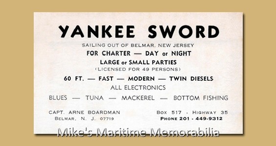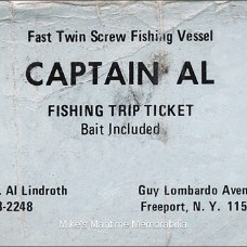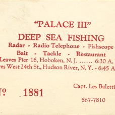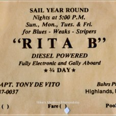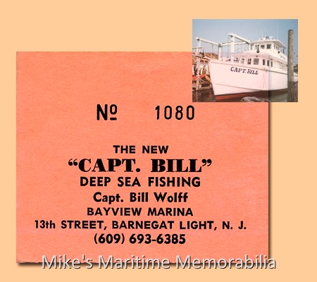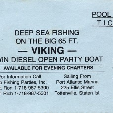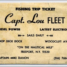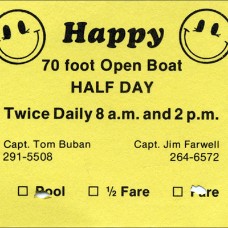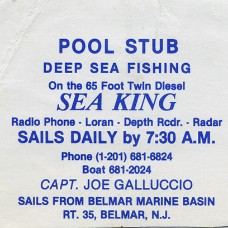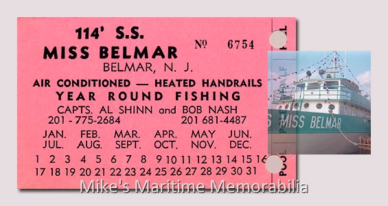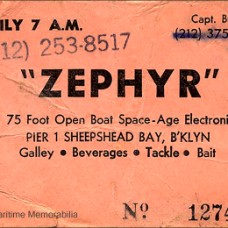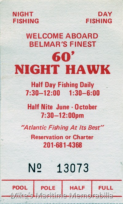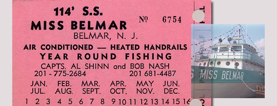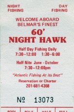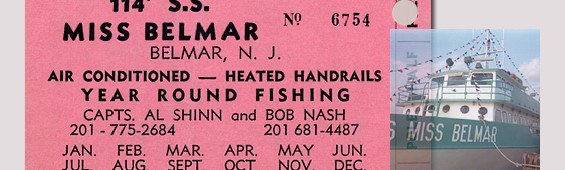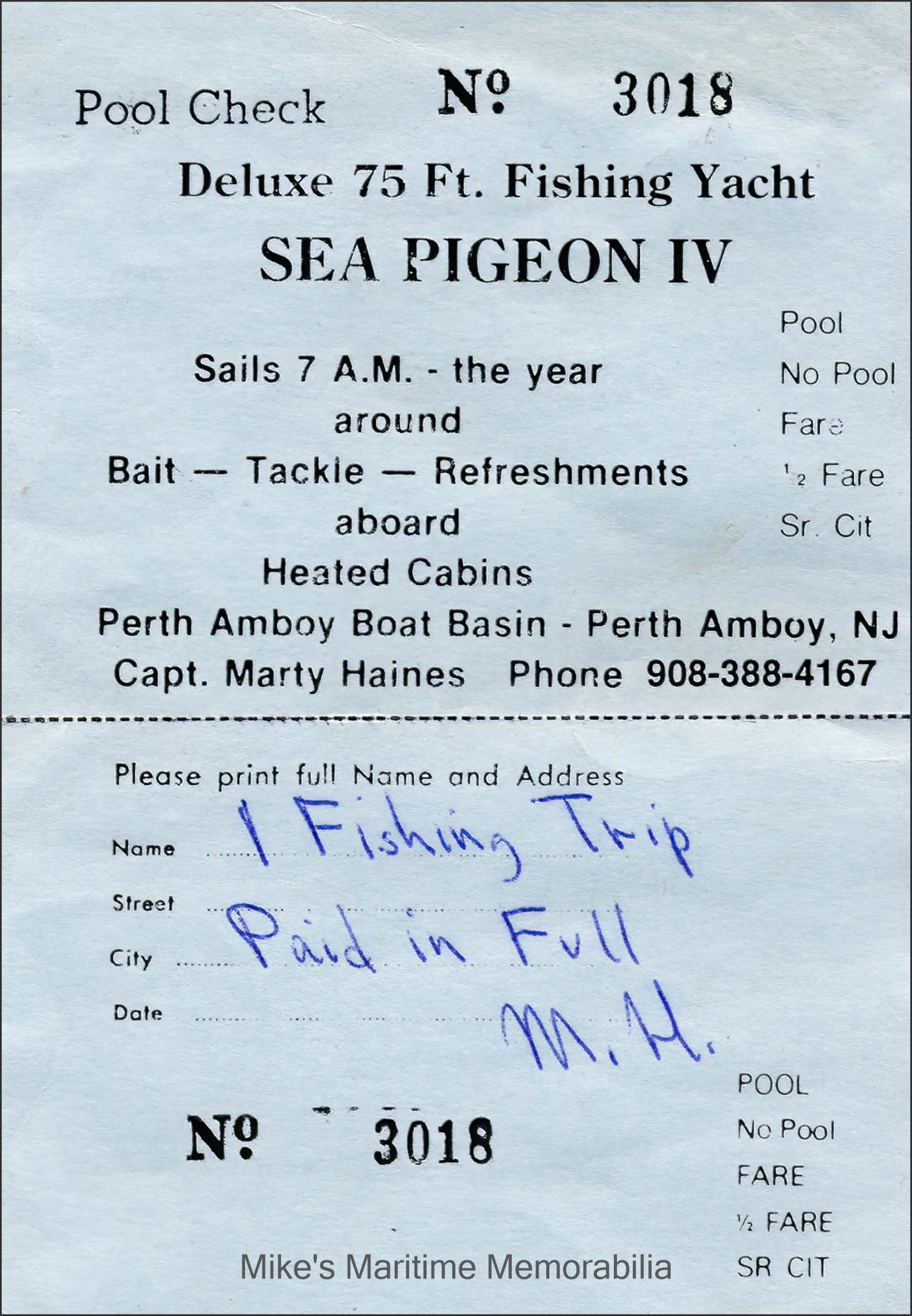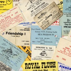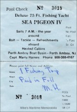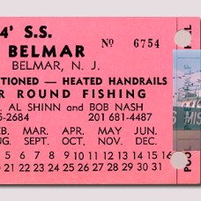 CAPT. JOE II Fare Ticket, Belmar, NJ – 1979 PALACE III Fare Ticket, Hoboken, NJ – 1979 YANKEE SWORD Fare Ticket, Belmar, NJ – 1980 CAPTAIN BILL Fare Ticket, Barnegat Light, NJ – 1981 FRIENDSHIP I Fare Ticket, Brooklyn, NY – 1981 BLUE SEA III Fare Ticket, Brooklyn, NY – 1982 RITA B Fare Ticket, Highlands, NJ – 1982 ZEPHYR Fare Ticket, Brooklyn, NY – 1982 SATELLITE Fare Ticket, Atlantic Highlands, NJ – 1983 S.S. MISS BELMAR Fare Ticket, Belmar, NJ – 1984 CAPTAIN AL Fare Ticket, Freeport, NY – 1985 Party Boat Fare Ticket Collage – 1985 SEA KING Fare Ticket, Belmar, NJ – 1985 CAPT. LOU FLEET Fare Ticket – 1986 NIGHT HAWK Fare Ticket, Belmar, NJ – 1987 SEA PIGEON IV Fare Ticket, Perth Amboy, NJ – 1987 TEAL Fare Ticket, Leonardo, NJ – 1987 VIKING Fare Ticket, Staten Island, NY – 1987 DOROTHY B VII Fare Ticket, Brooklyn, NY – 1988 HAPPY Fare Ticket, Atlantic Highlands, NJ – 1988 Fare Tickets - Page 1