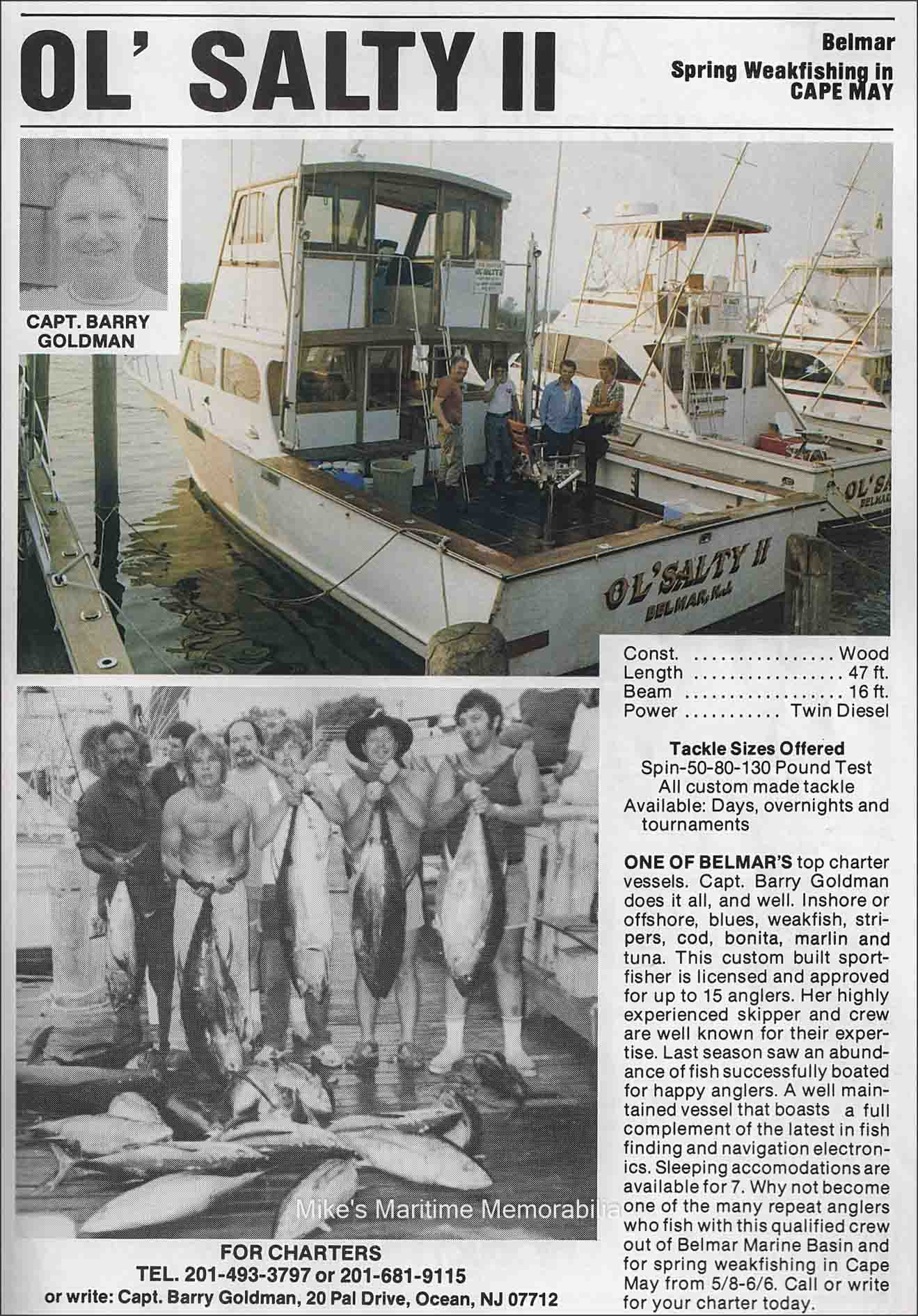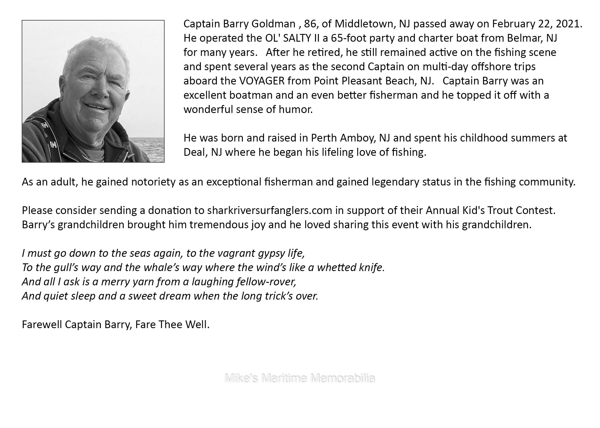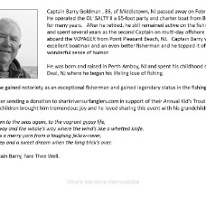 IN MEMORIUM – CAPTAIN BARRY GOLDMAN 1935-2021 OL' SALTY II, Belmar, NJ – 1986 OL' SALTY II, Belmar, NJ – 1983 Captains Barry Goldman and George Bachert, Highlands, New Jersey – 1975 A pensive Barry before a Tilefish trip on the Voyager in 2009 HELEN H cod in 2006 VOYAGER Tilefish in 2007 VOYAGER Tilefish in 2007 VOYAGER Wreckfish in 2009 VOYAGER Tilefish in 2008 VOYAGER Cod in 2010 Honesty is the best policy! Cod in 2010 A bird on the head is worth two in the bush in 2010 VOYAGER Tilefish in 2010 VOYAGER Wreckfish in 2010 VOYAGER Tilefish in 2011 2011 Bragging Rights Captain Stan Zagleski III 1967 - 2021Captain Jeff Gutman 1967 - 2020