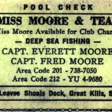 IN MEMORIAM - CAPTAIN FRED MOORE 1926-2008 TEAL, Perth Amboy, NJ – 1948 Atlantic City Marlin Tournament – 1958 MISS MOORE, Great Kills, NY – 1959 MISS MOORE Tuna, Great Kills, NY – 1960 TEAL, Great Kills, NY – 1962 TEAL Tuna Catch – 1963 TEAL Shark, Great Kills, NY – 1963 Captains Everett 'Eve' and Fred Moore, MISS MOORE, Great Kills, NY – 1963 MISS MOORE, Great Kills, NY – 1964 TEAL, Great Kills, NY – 1964 TEAL Tuna Trip, Staten Island, NY – 1966 SHOALS DOCK, Great Kills, NY – 1964 MISS MOORE, Great Kills, NY – 1965 TEAL, Great Kills, NY – 1965 MISS MOORE and TEAL Fare Ticket – 1973 MISS MOORE, Staten Island, NY – 1984 TEAL Fare Ticket, Leonardo, NJ – 1987 Captin Fred Moore and Mike Daniewicz - May 2006. Captain 'Freddie' Moore and Ken Ekberg, Staten Island, NY – 2007 Captain Gary Bouchard 1938 - 2009Captain Mickey Vassallo 1941 - 2007