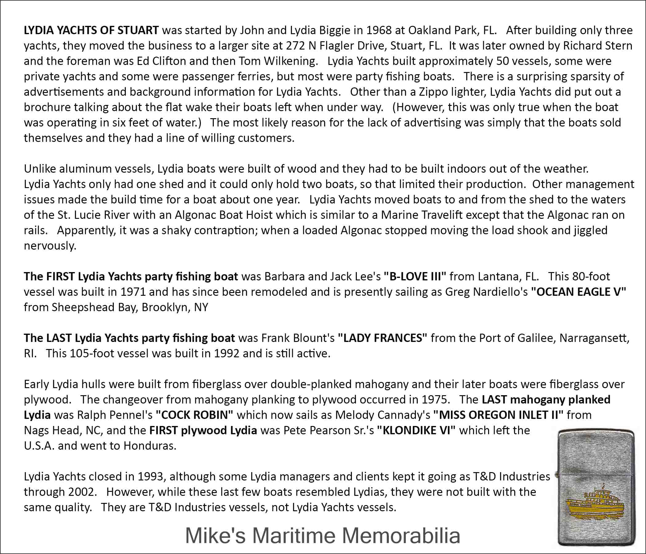 Lydia Yachts of Stuart B-LOVE III, Lantana, FL – 1971 COCK ROBIN, Point Pleasant Beach, NJ – 1975 HOLIDAY, Point Pleasant Beach, NJ – 1975 KLONDIKE VI, New Rochelle, NY – 1975 CAPT. BOB, West Palm Beach, FL – 1976 BLUE HERON II, Riviera Beach, FL – 1977 SEA DEVIL launch, Stuart, FL – 1979 STARFISH, Sea Isle City, NJ – 1980 CAPTAIN'S LADY II, Bowers Beach, DE – 1981 NORTH EASTERNER, Newburyport, MA – 1982 RANGER VII, Brooklyn, NY – 1983 HURRICANE, Murrells Inlet, SC – 1984 SHAMROCK, Point Pleasant Beach, NJ – 1984 FISHERMEN, Atlantic Higlands, NJ – 1985 MISS CAPE CANAVERAL, Ft. Myers, FL – 1985 MISS BELMAR II, Belmar, NJ – 1986 CAPTAIN'S LADY III, Bowers Beach, DE – 1987 SEA FARER, Hampton Harbor, NH – 1987 ISLAND PRINCESS, Stuart, FL – 1990 Lydia Yachts Page 2