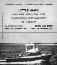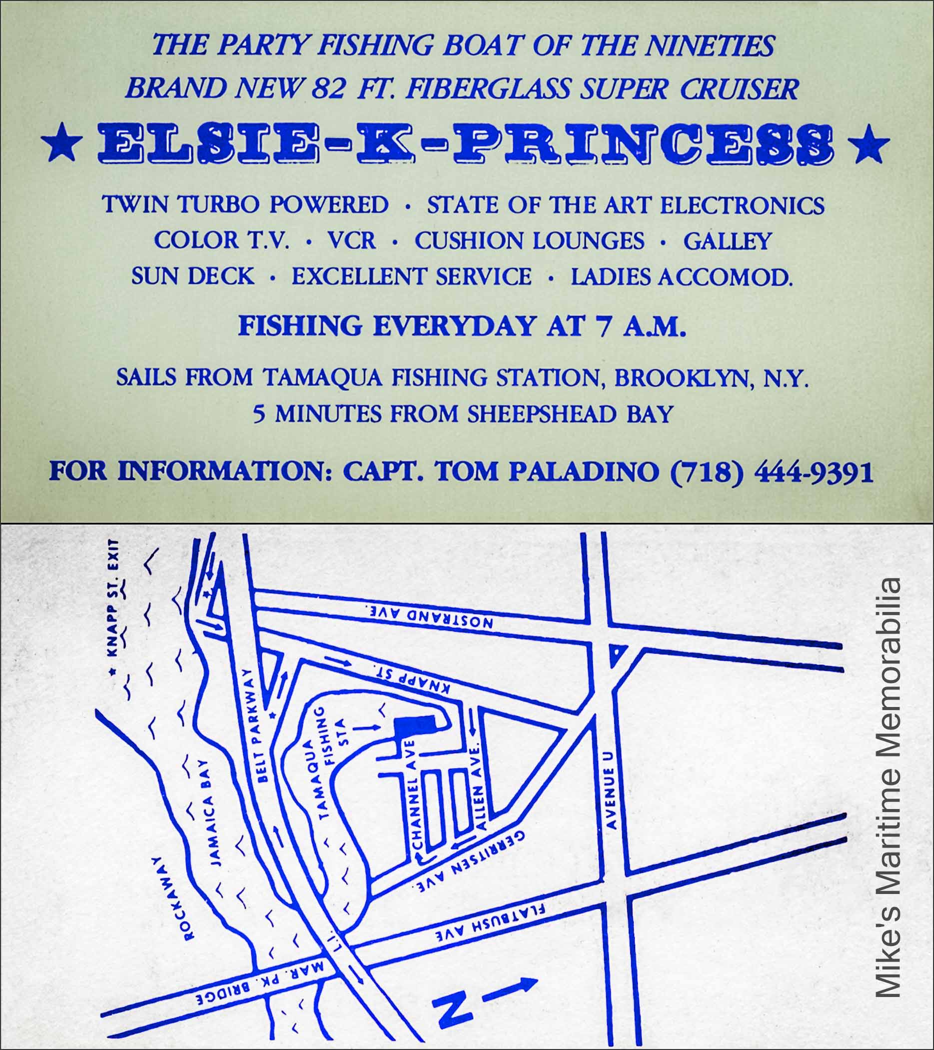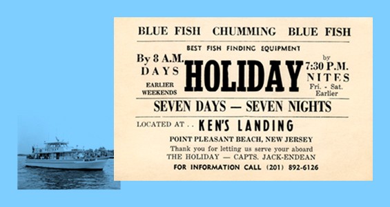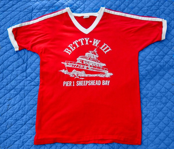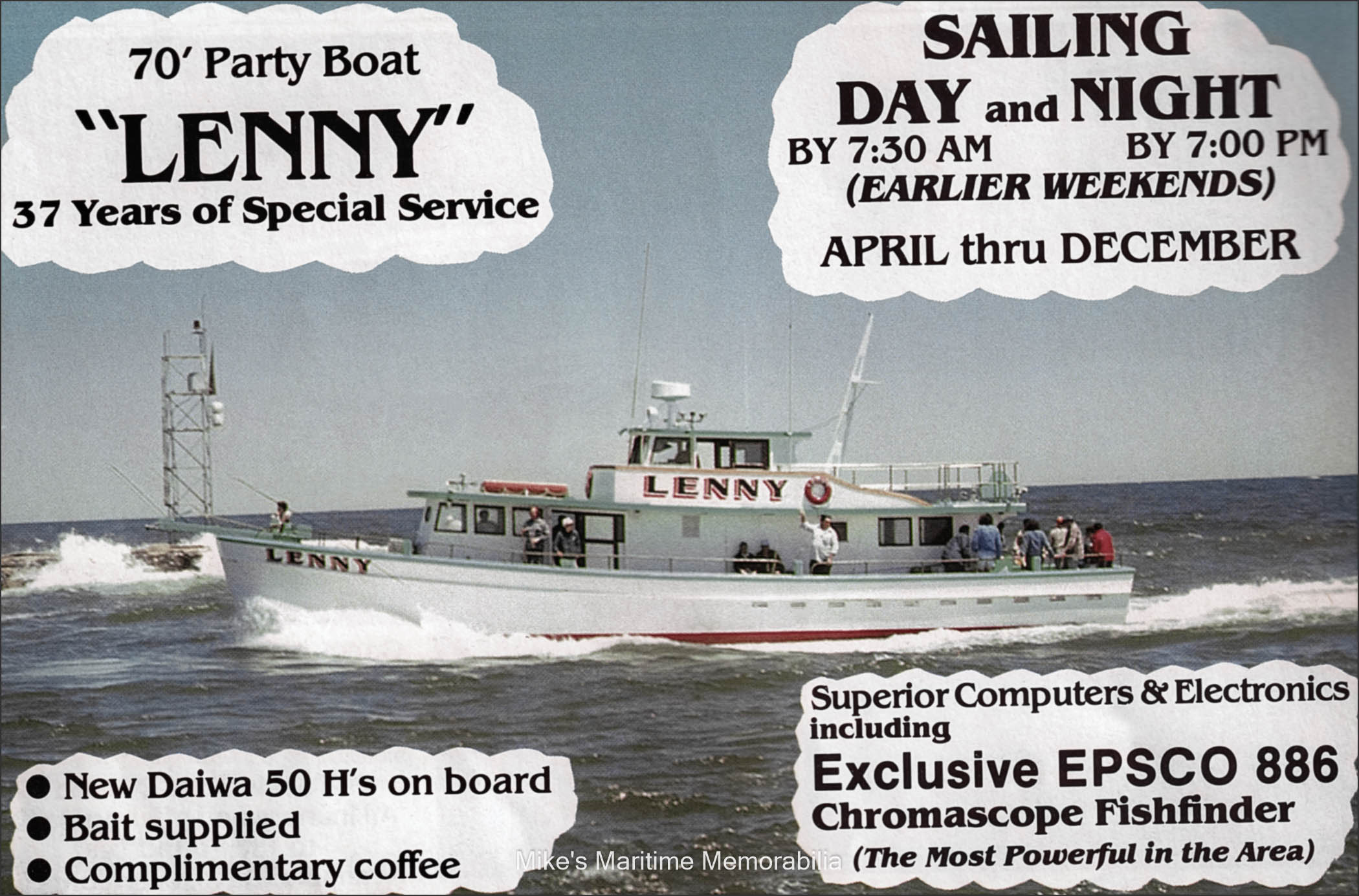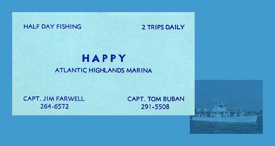 BIG MOHAWK II Advertising Sign, Brooklyn, NY – 1979 HOLIDAY Advertising Card – 1979 LYDIA YACHTS Zippo Lighter, Stuart, FL – 1979 BIG MARIE-S Fishing Pin, Belmar, NJ – 1980 HAPPY Business Card, Atlantic Highlands, NJ – 1981 MISS TAKE II Fishing Hat, Highlands, NJ – 1981 SEA PIGEON III Article, Perth Amboy, NY – 1981 CAPT. LOU FLEET Advertising Pin – 1982 SCHAEFER BEER WHOPPER STOPPER Pin, New York, NY – 1982 LENNY Advertisement, Belmar, NJ – 1983 PALACE FLEET Shirt Patch, Hoboken, NJ – 1983 SEA RAIDER Fishing Pin, Wildwood, NJ – 1983 BETTY W III T-shirt, Brooklyn, NY – 1984 VIKING Fleet Shirt, Montauk, NY – 1984 CAPT. WHITTAKER Shirt, Captree, NY – 1985 PILOT II T-shirt, Brooklyn, NY – 1985 GOLDEN EAGLE Fishing Jig, Belmar, NJ – 1986 LITTLE HAWK Business Card, Atlantic Highlands, NJ – 1986 ELSIE-K PRINCESS Business Card, Gerritsen Beach, Brooklyn, NY – 1988 Fish Tales Bait & Tackle Truck, Perth Amboy, NJ – 1988 Memorabilia - Page 5Memorabilia - Page 7