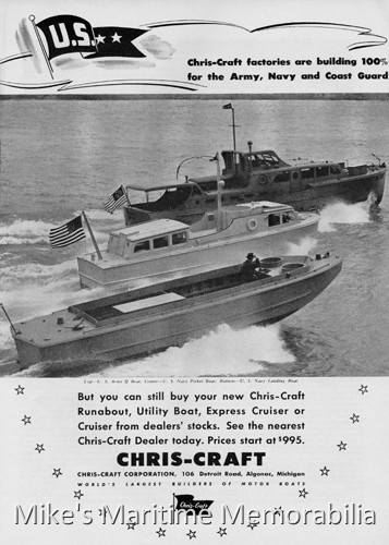 A Chris-Craft Corporation boat advertisement from "Motor Boating" magazine June 1942. During World War II, all new boats went to our armed services, but the advertisement was trying to sell existing pre-war stock.