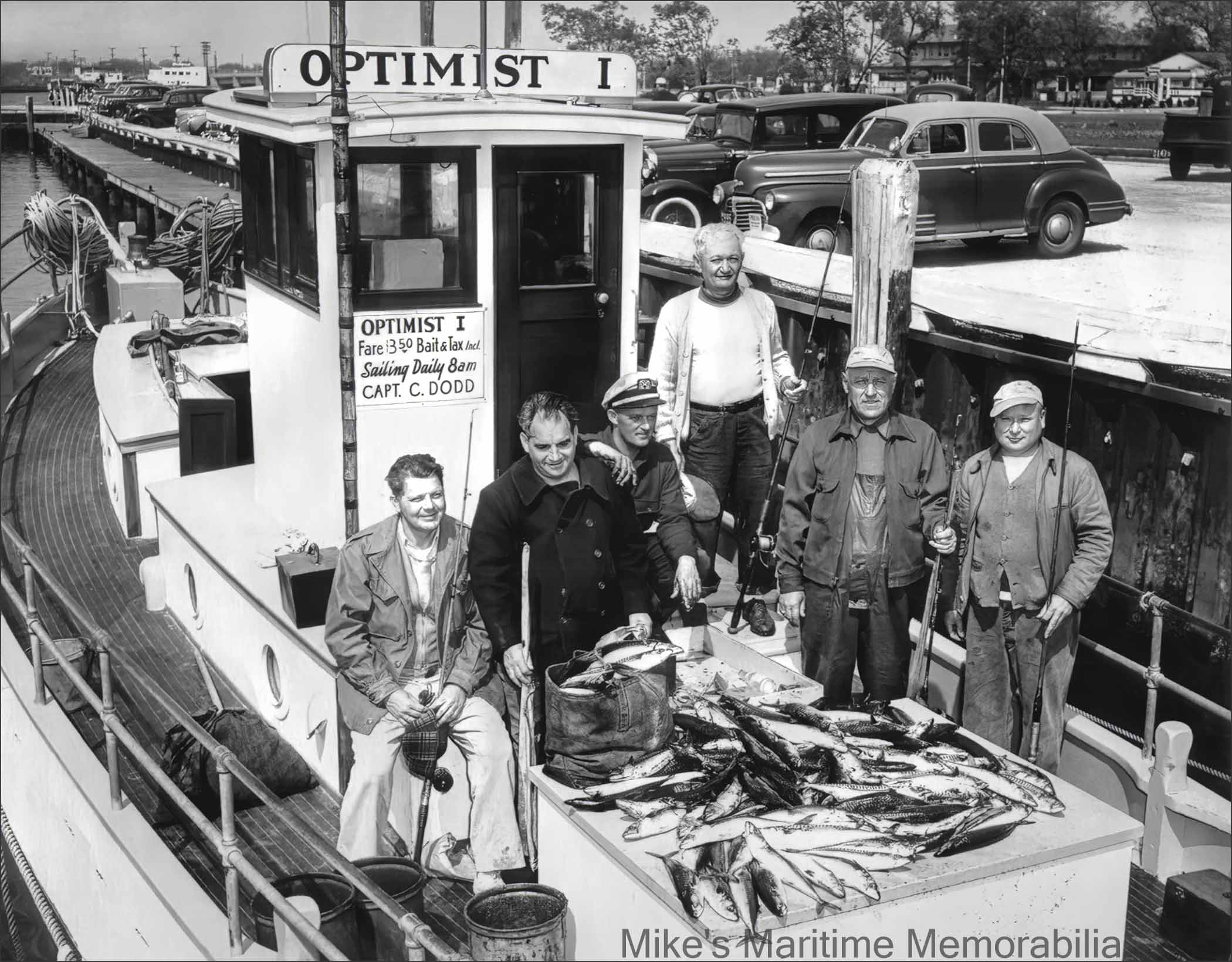 OPTIMIST I, Belmar, NJ – 1951 Captain Charlie Dodd is shown here with a group of 'regulars' after returning from a day of Mackerel fishing aboard his "OPTIMIST I" in the spring of 1951. In 1939, Captain Dodd was the first party boat operator to sail from the newly opened Belmar Marina at Belmar, NJ. Ernest Feidler built the "OPTIMIST I" in 1946 at his Bergen Beach Boatworks at Brooklyn, NY. She was sold in 1952 and became Captain Doug Macintosh’s "IDEAL I" from Point Pleasant Beach, NJ. The photo is courtesy of Ray Dodd.